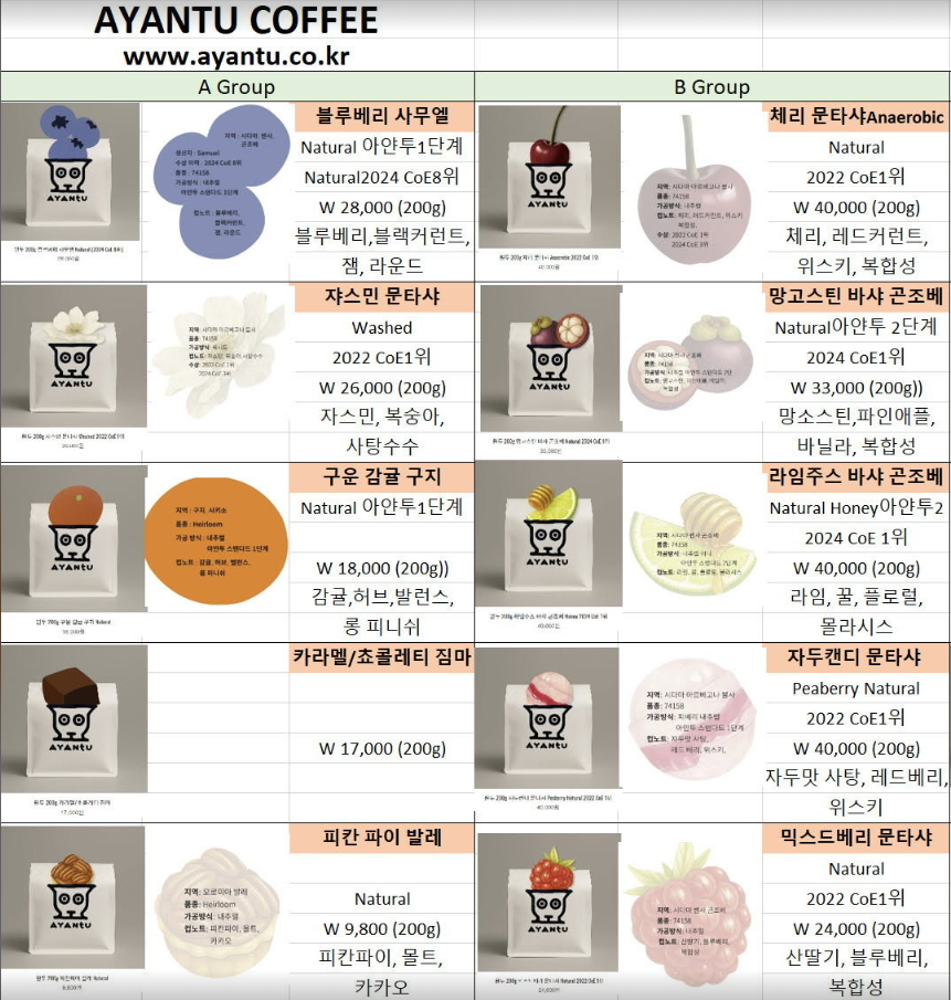 (예 : 커피 가전제품, 커피 용품, 커피 생두, 원두 커피 등)